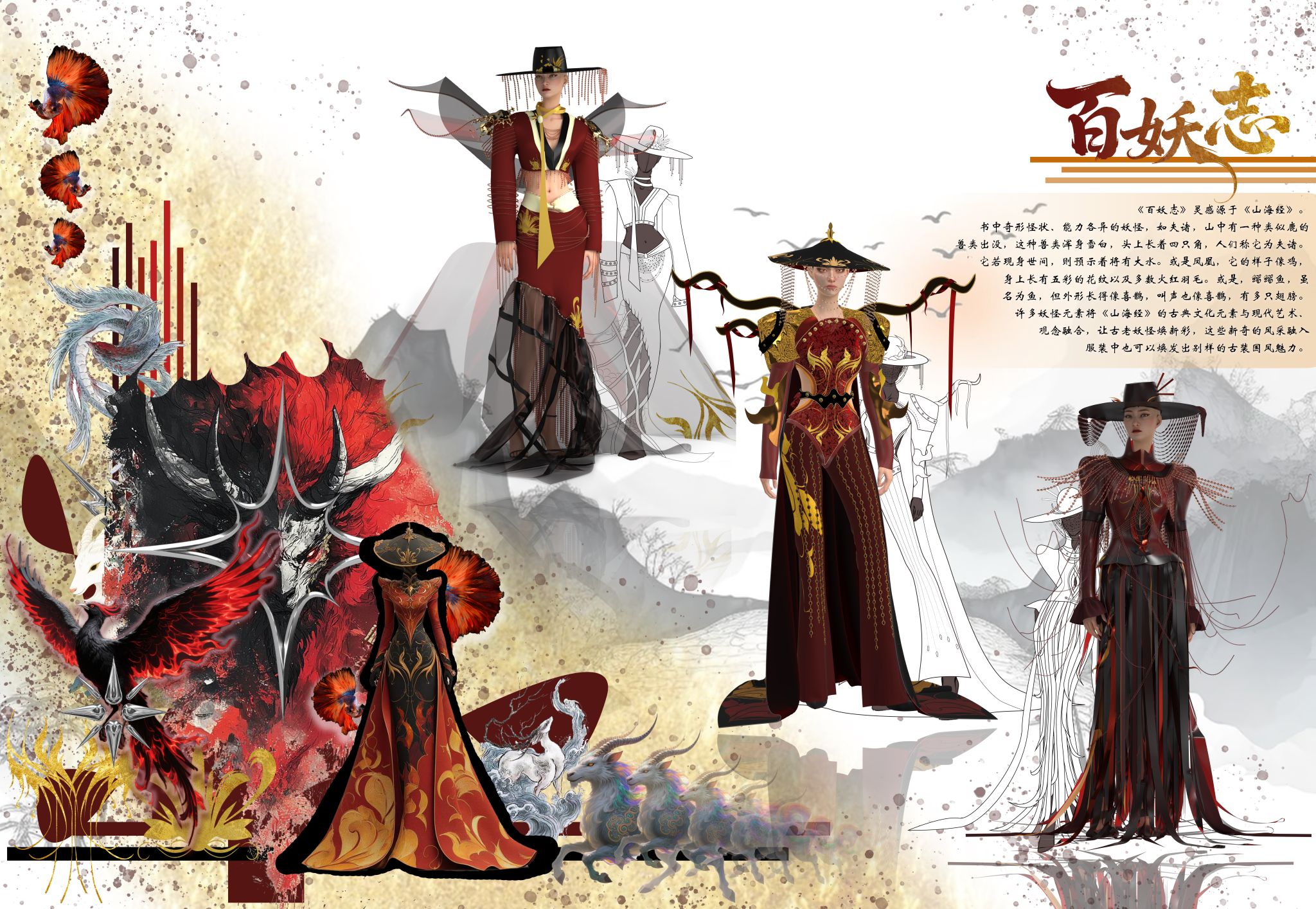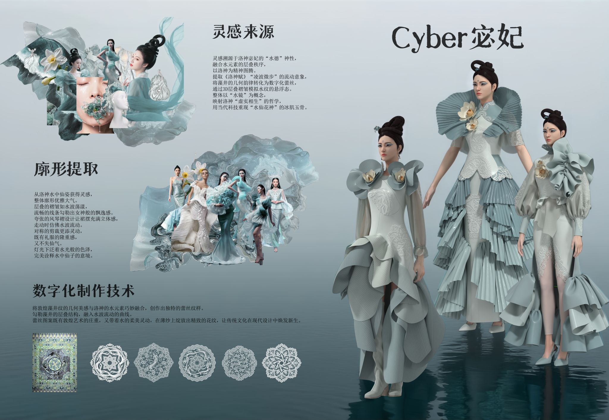 作品《百妖志》灵感源自《山海经》,精准还原凤凰多羽、鳛鳛鱼巨翅、夫诸四角等神话形象的核心特征,将传统神话元素与现代审美理念相融合,借助国产3D设计软件实现虚拟服装的动态呈现,彰显出浓厚的东方奇幻风格;《cyber宓妃》则以洛神宓妃为原型,追溯其“水德”神性与“水仙花神”形象,融合传统意境与科技元素,探索服装设计在数字化语境下的创新表达,体现了对中华优秀传统文化的创造性转化与创新性发展。