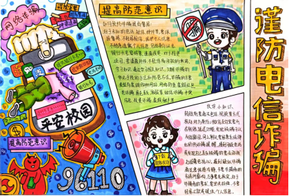在征集到的作品中,海报作品用“刷单返利”“客服来电”等场景化漫画直击高发骗局;手抄报以 A3 版面系统梳理“虚假购物”“游戏点卡”等校园陷阱,并标注“转账前三问”“96110 必接听”等口诀;书法作品则将“转账之前多核实,个人信息锁心底”写成对仗警句,实现“一墙一警示”。